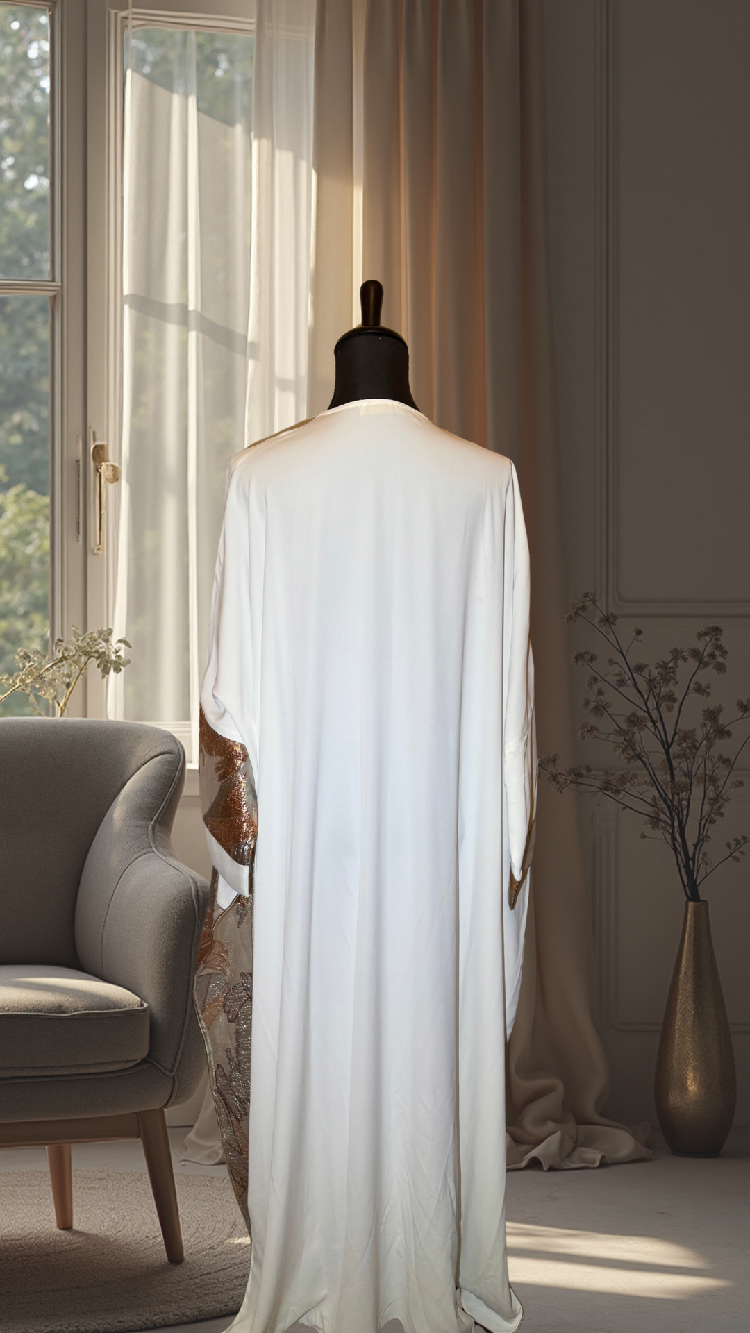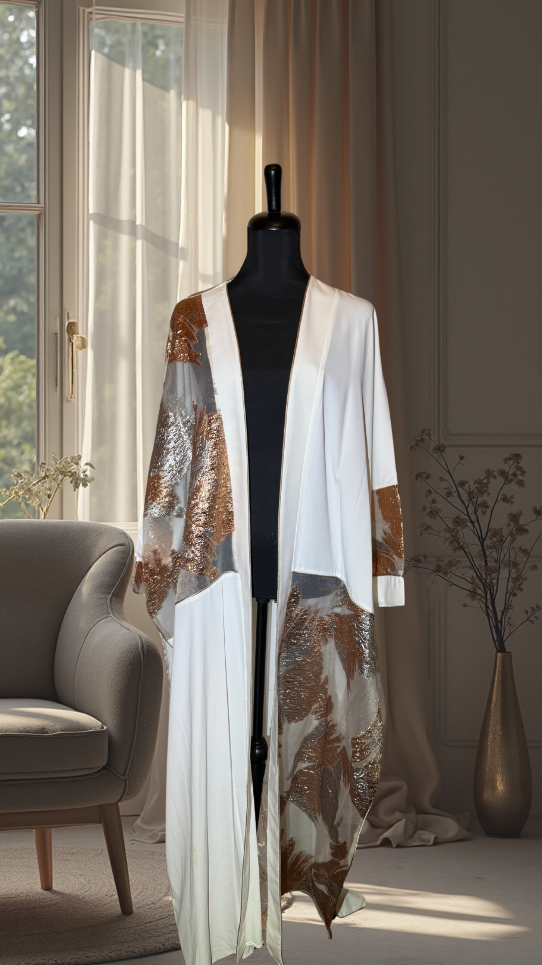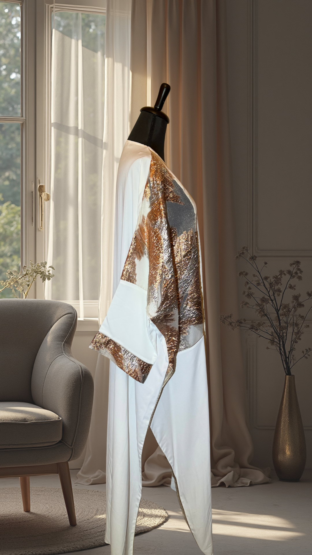 Le bisht Aylin incarne la douceur, la lumière et l’élégance. Sa base blanche pure apporte un style raffiné et intemporel, tandis que les larges panneaux métallisés cuivrés offrent des reflets chauds et précieux. Une pièce rare, sophistiquée, parfaite pour les cérémonies, mariages, soirées, et toutes les occasions où vous souhaitez briller sans en faire trop.