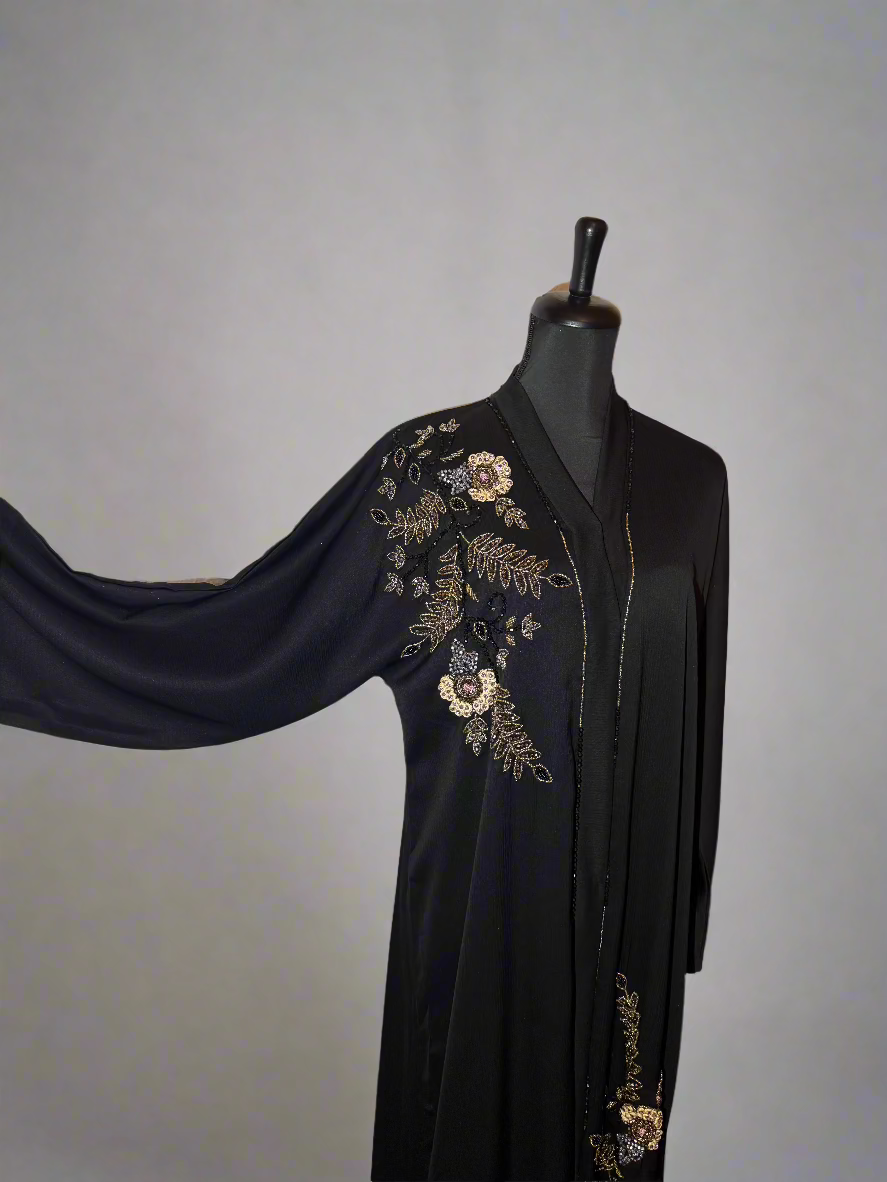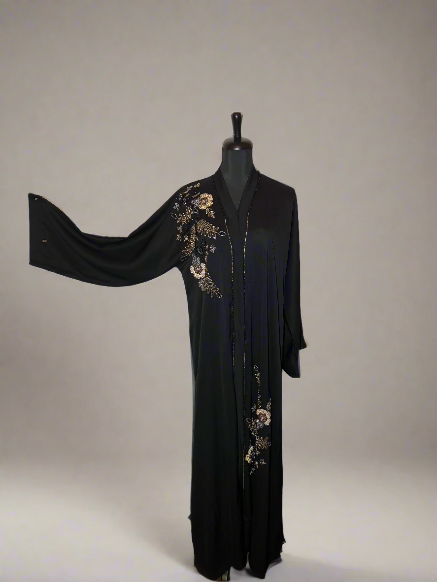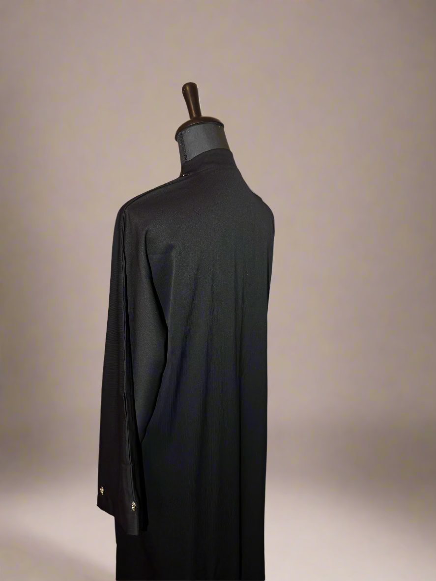 Diana est une abaya sophistiquée, ornée d'une broderie délicate qui longe toute sa longueur. Sa coupe polyvalente permet de la porter fermée pour un style classique et élégant, ou ouverte façon kimono pour une allure plus décontractée.
