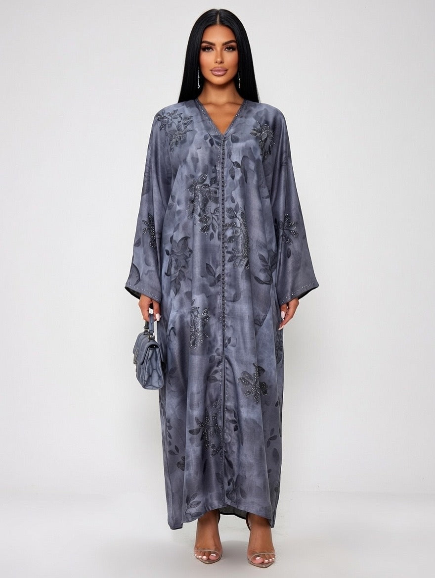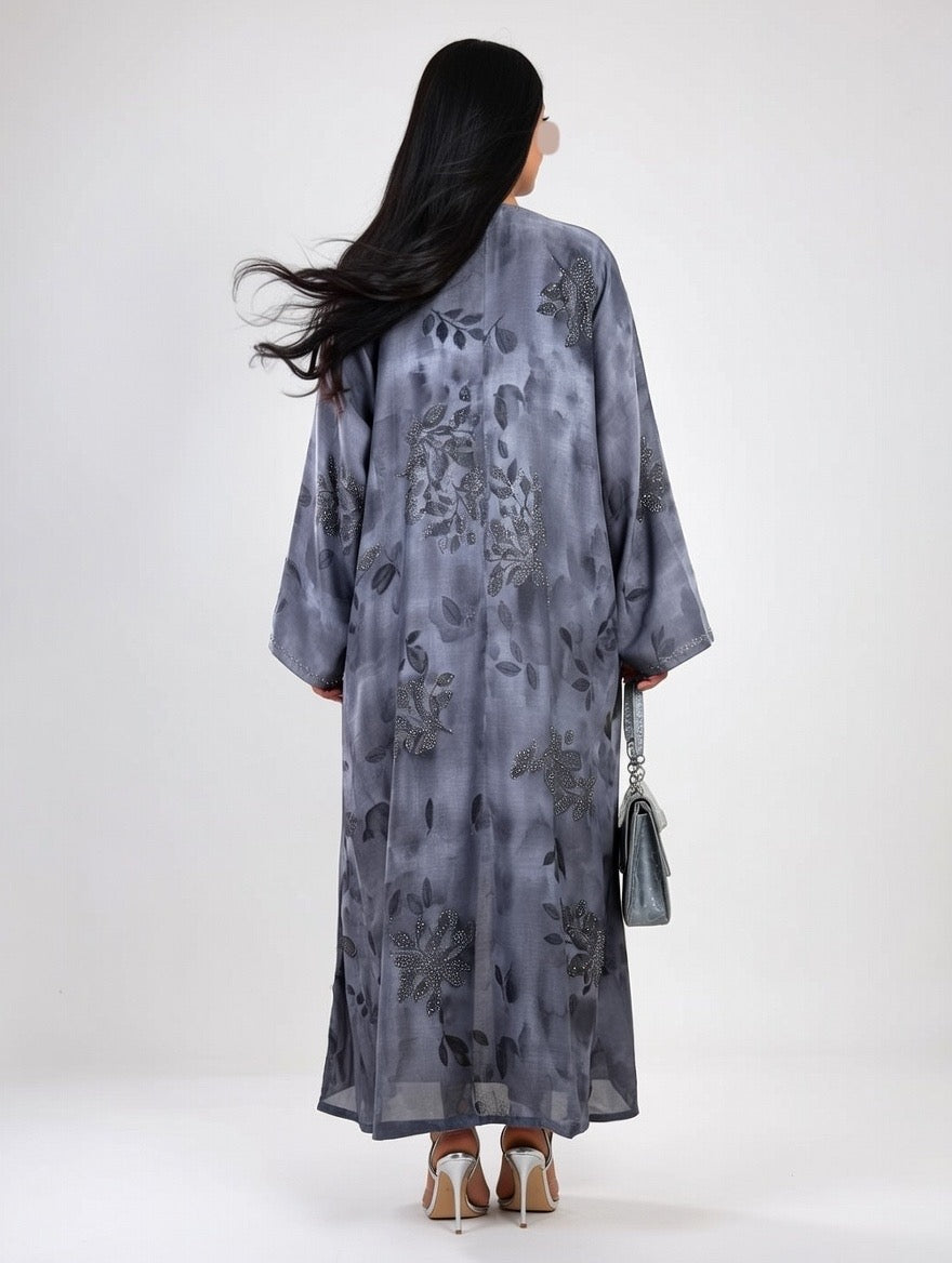 - Abaya longue gris fumé : allure nette, élégance intemporelle
