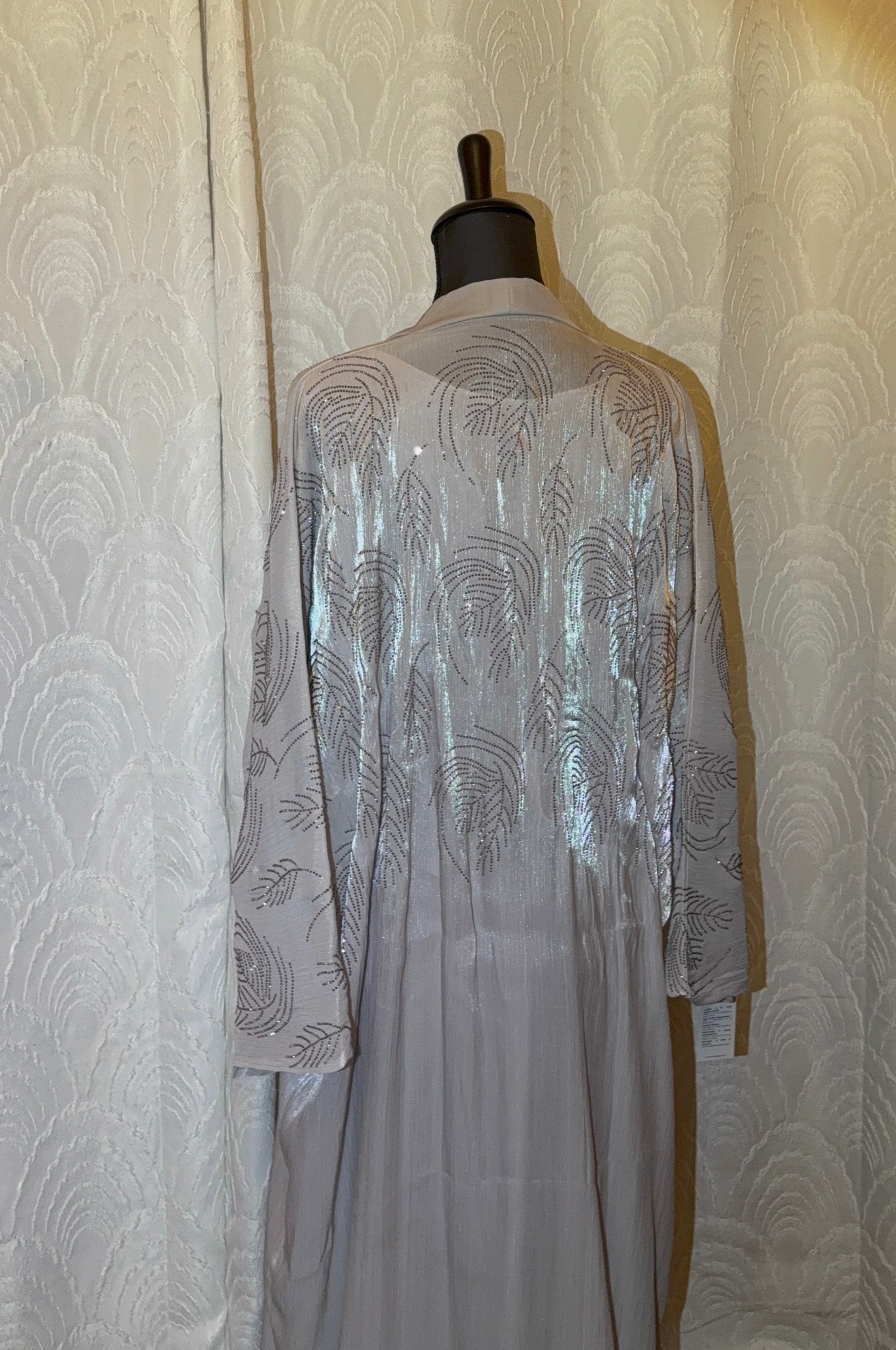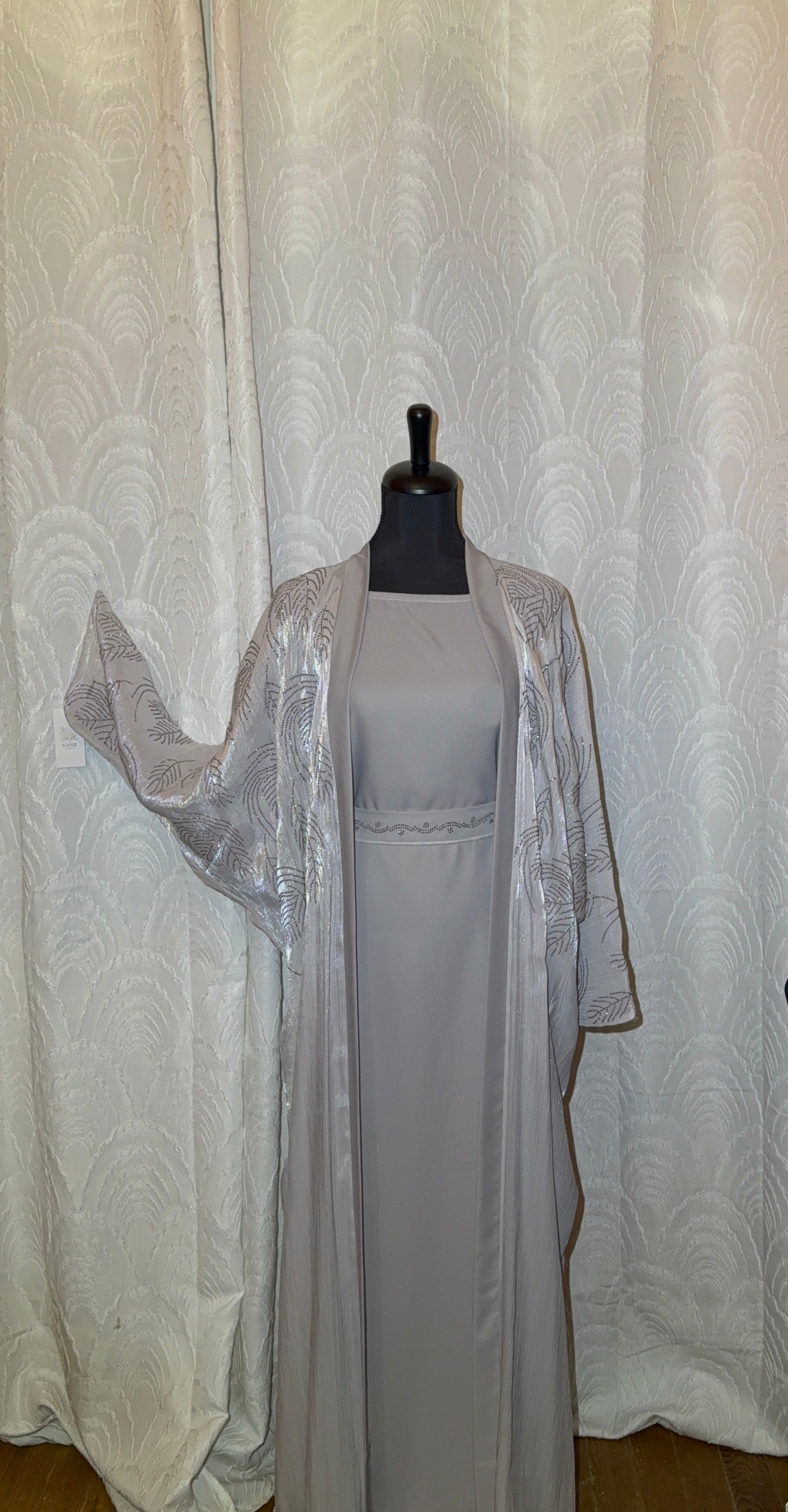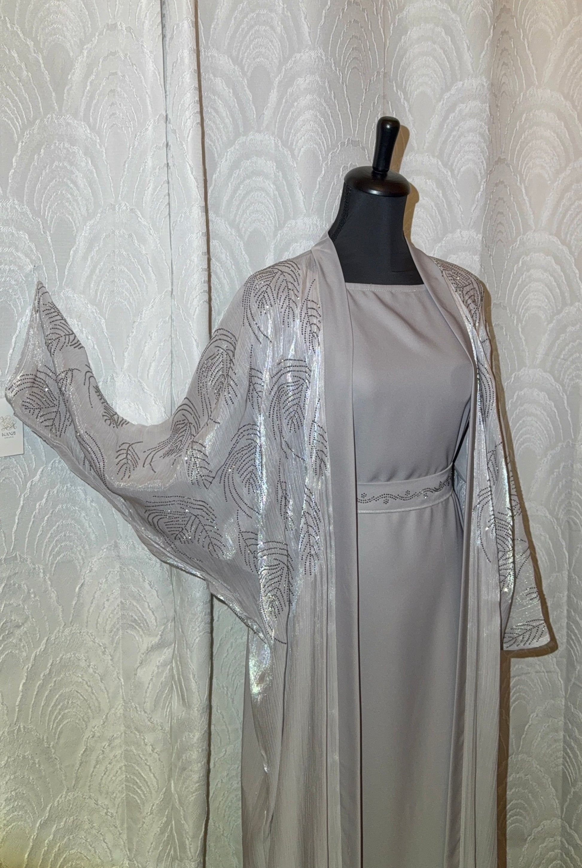 Le kimono en organza satiné présente de magnifiques motifs brillants aux reflets argentés, tandis que la sous-abaya affiche une coupe simple, avec manches 3/4 pour plus de confort et de style.