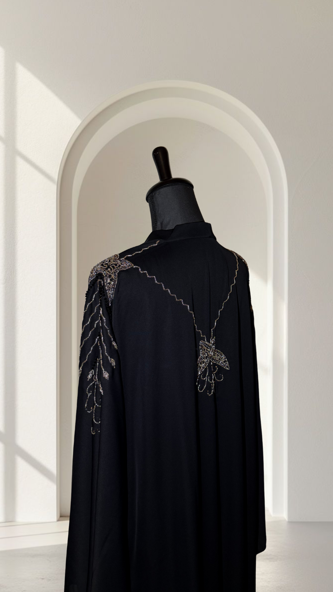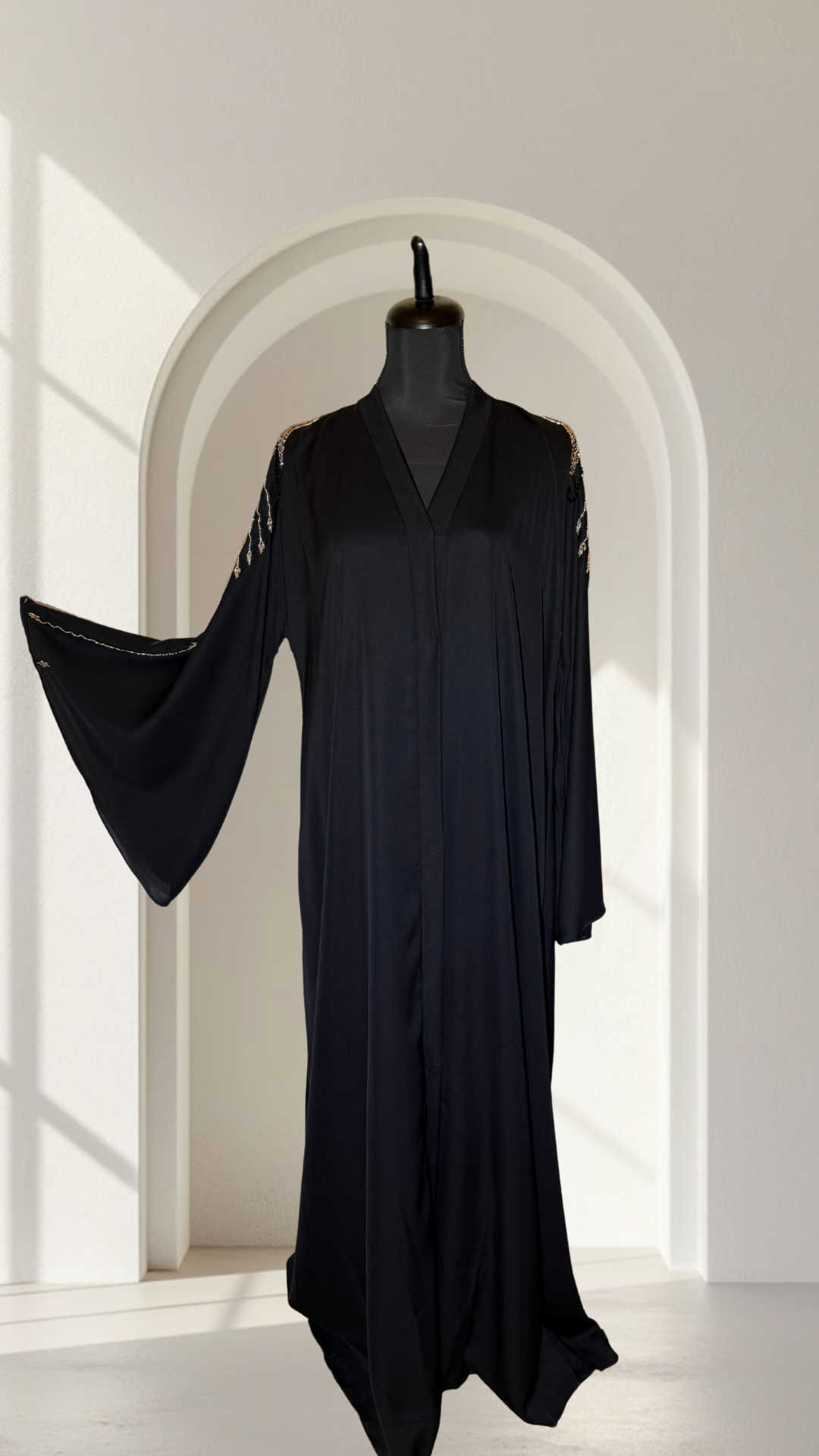Découvrez notre abaya noire, une pièce à la fois classique et raffinée, confectionnée en soie coréenne fluide et légère pour un tombé parfait.