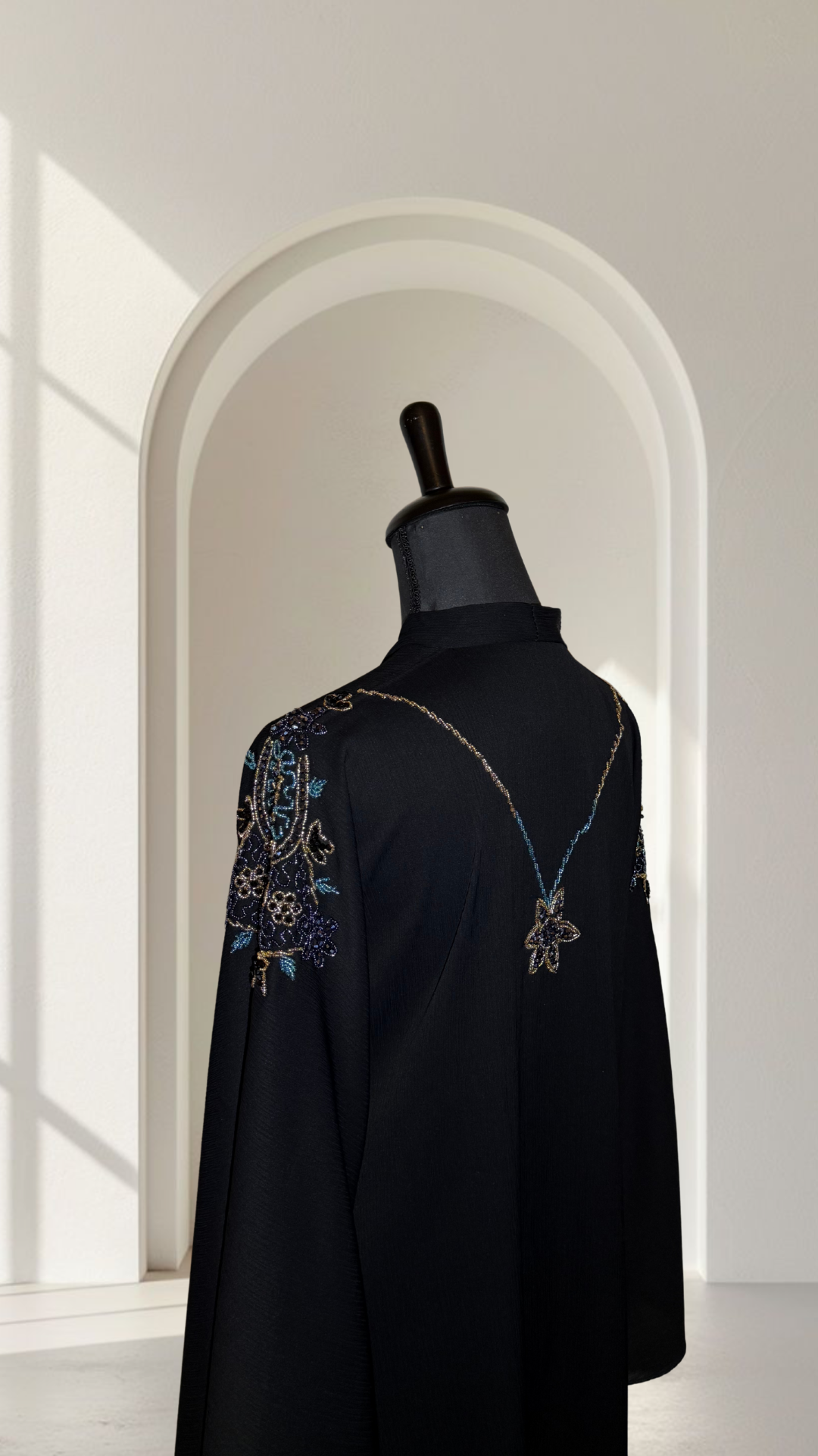 Pensée pour tomber parfaitement et capter la lumière avec retenue, Rabia marie un tombé souple à des ornements travaillés. Les perles brodées dessinent de fines lignes précieuses qui soulignent l’épaule et le dos sans alourdir la tenue.
