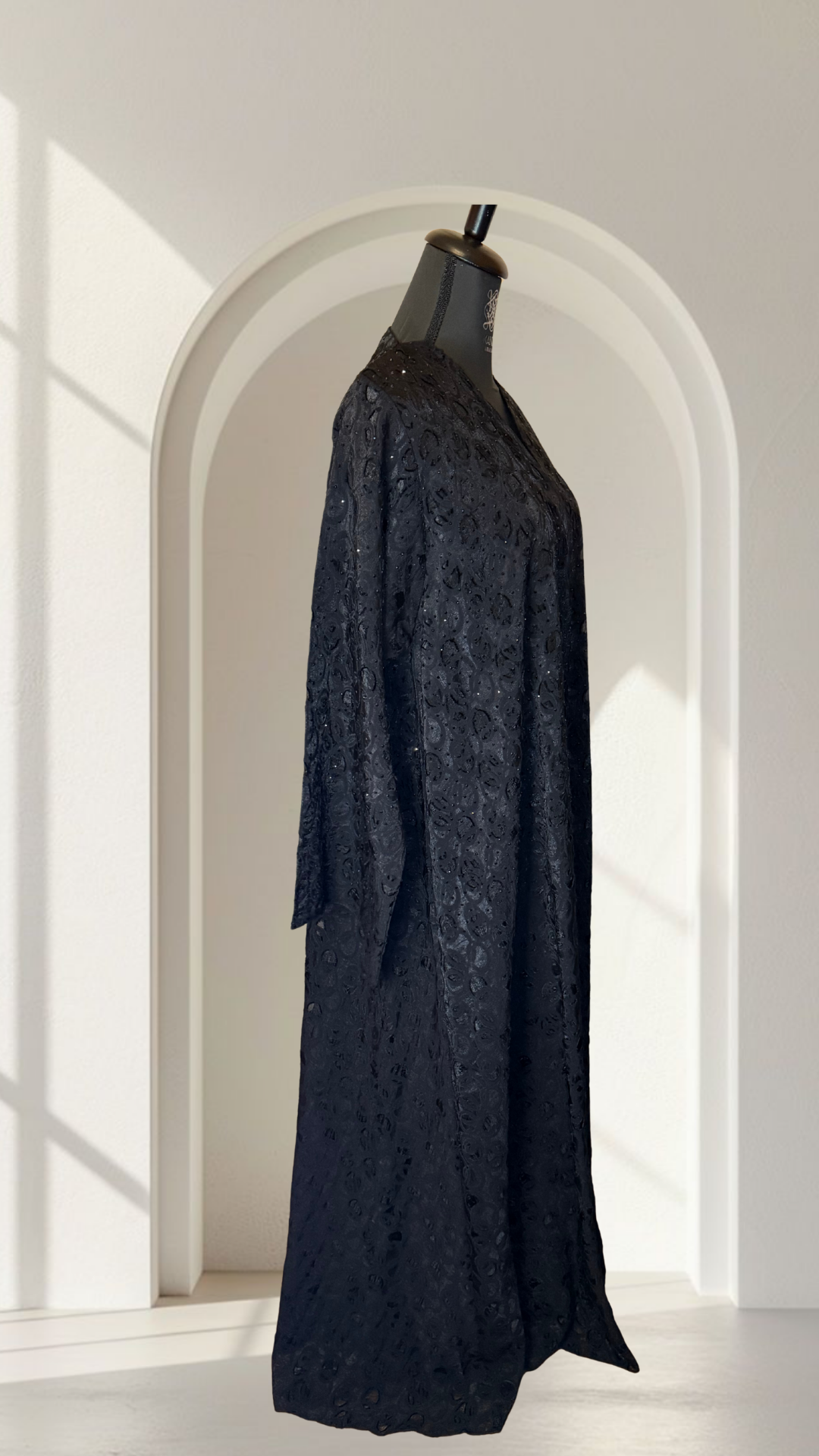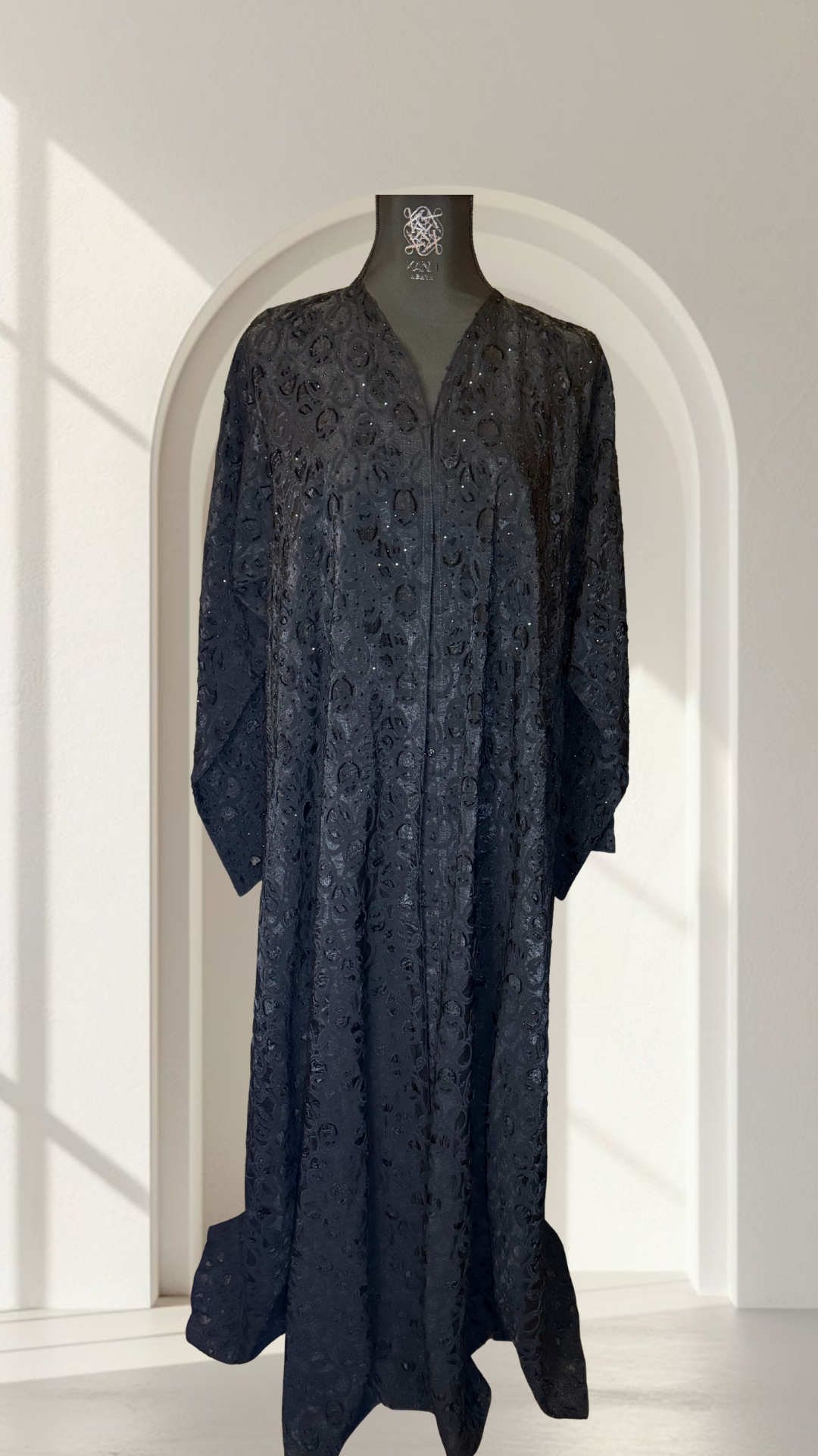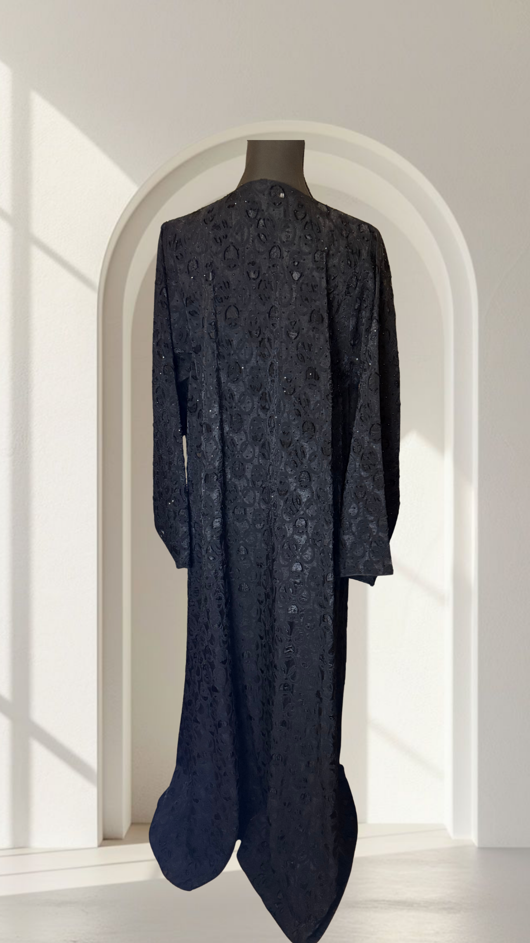 Abaya cloche .Tissu noir premium à la texture riche et sophistiquée, sublimé par des motifs en relief au toucher velouté. De fins strass délicatement incrustés apportent une brillance subtile, révélant un jeu de lumière élégant et maîtrisé