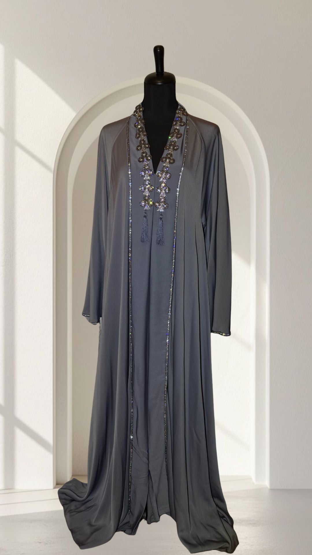 Strass scintillants le long de l’abaya et sur le col, pour un éclat irrésistible.