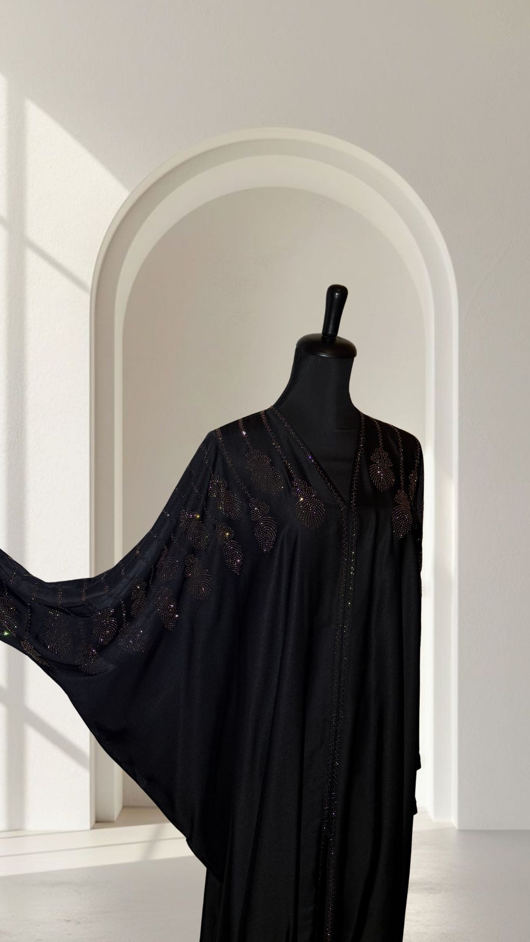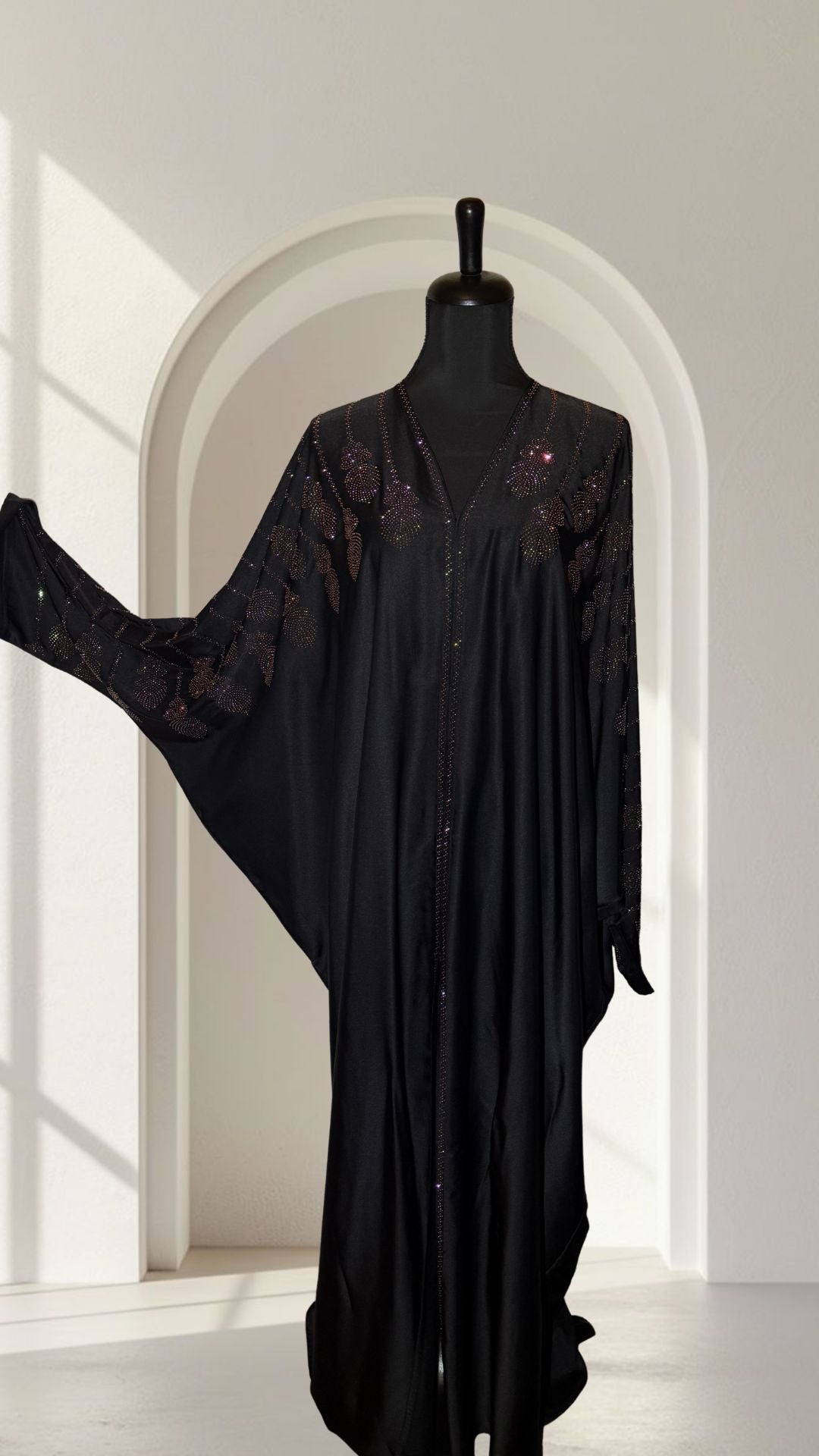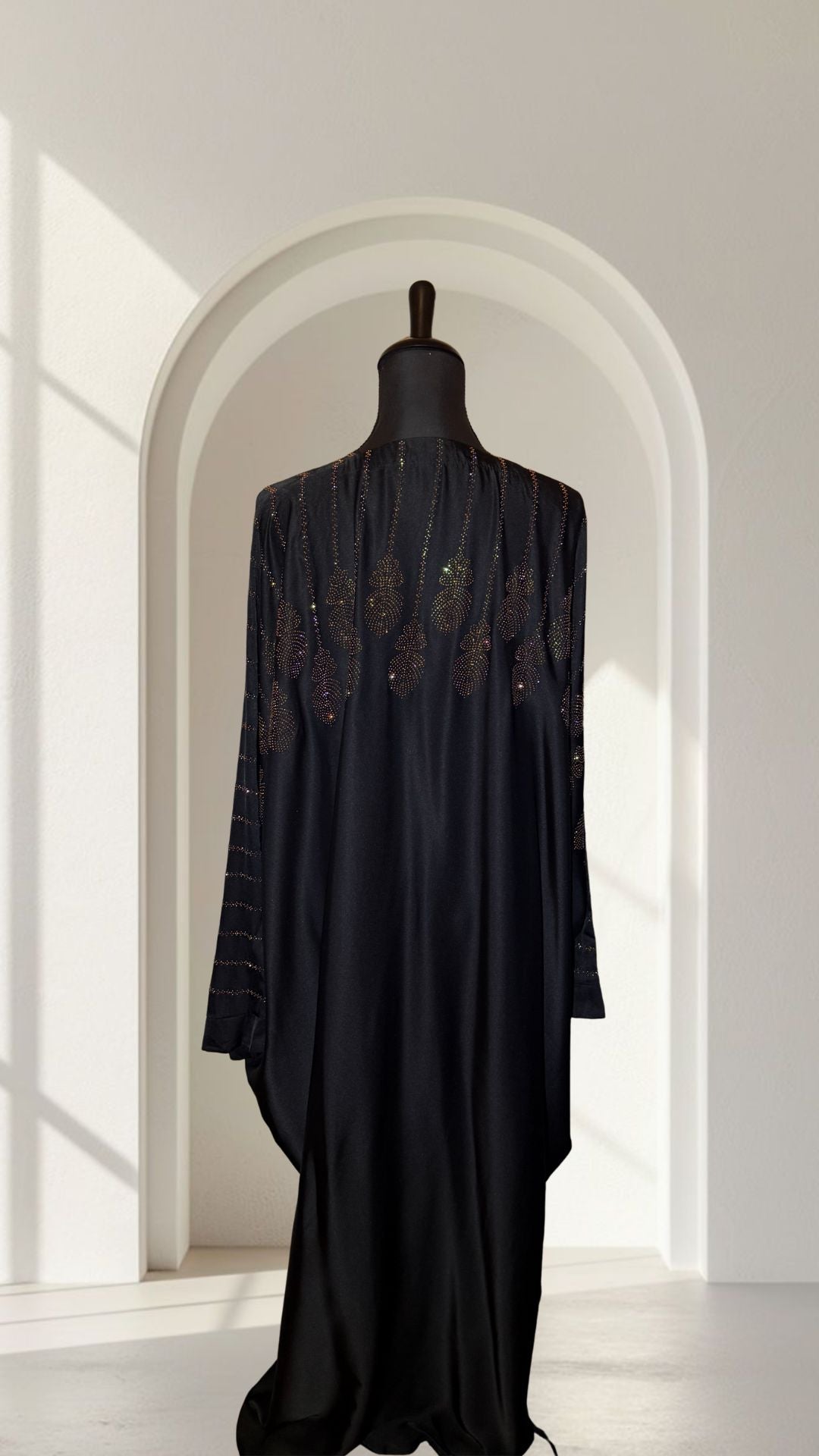 L’Abaya Tesnim incarne l’élégance avec sa coupe papillon fluide en satin soyeux. Ses détails raffinés en strass et broderies sur le devant, les manches et le dos apportent une touche lumineuse et distinguée.