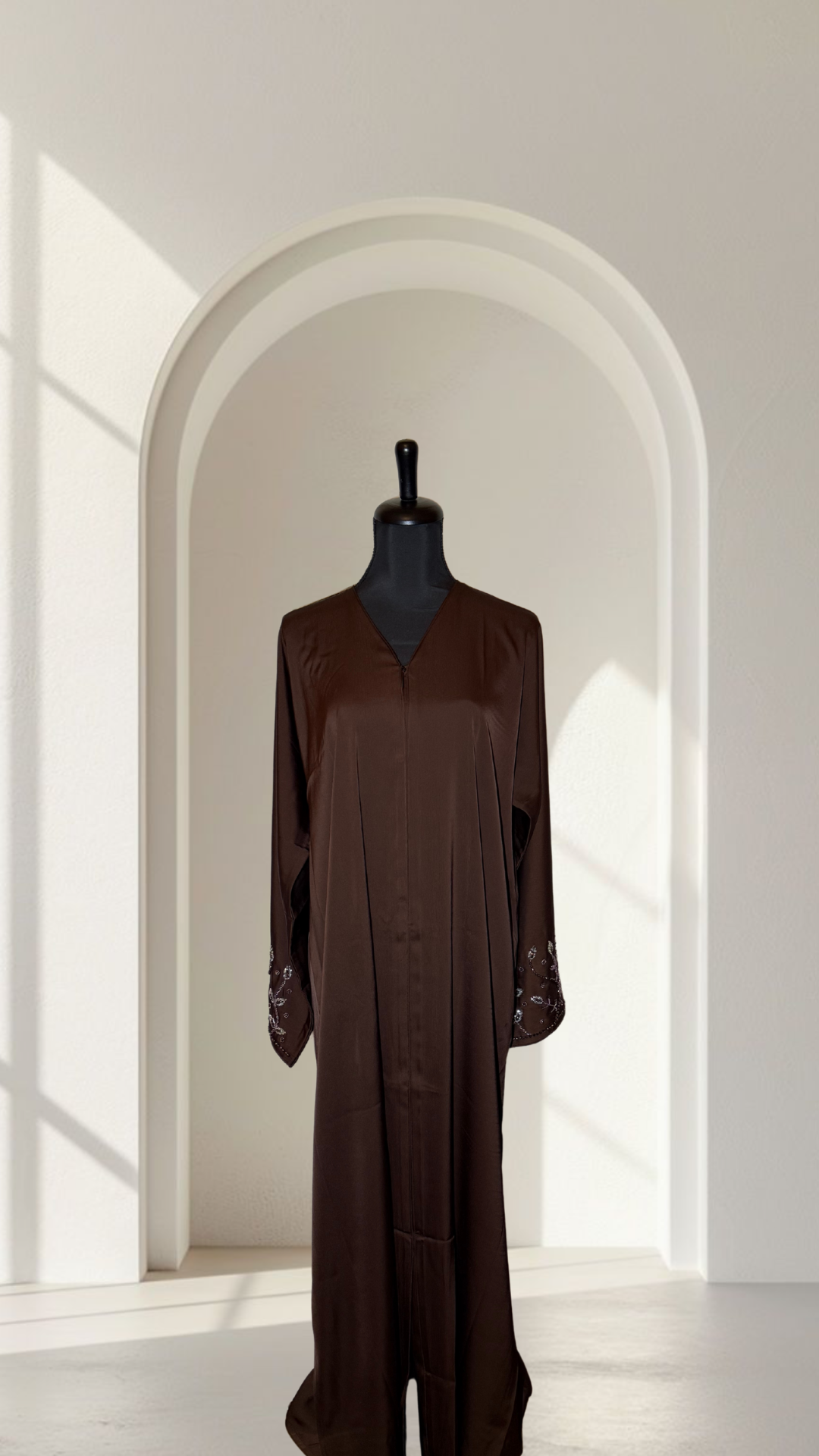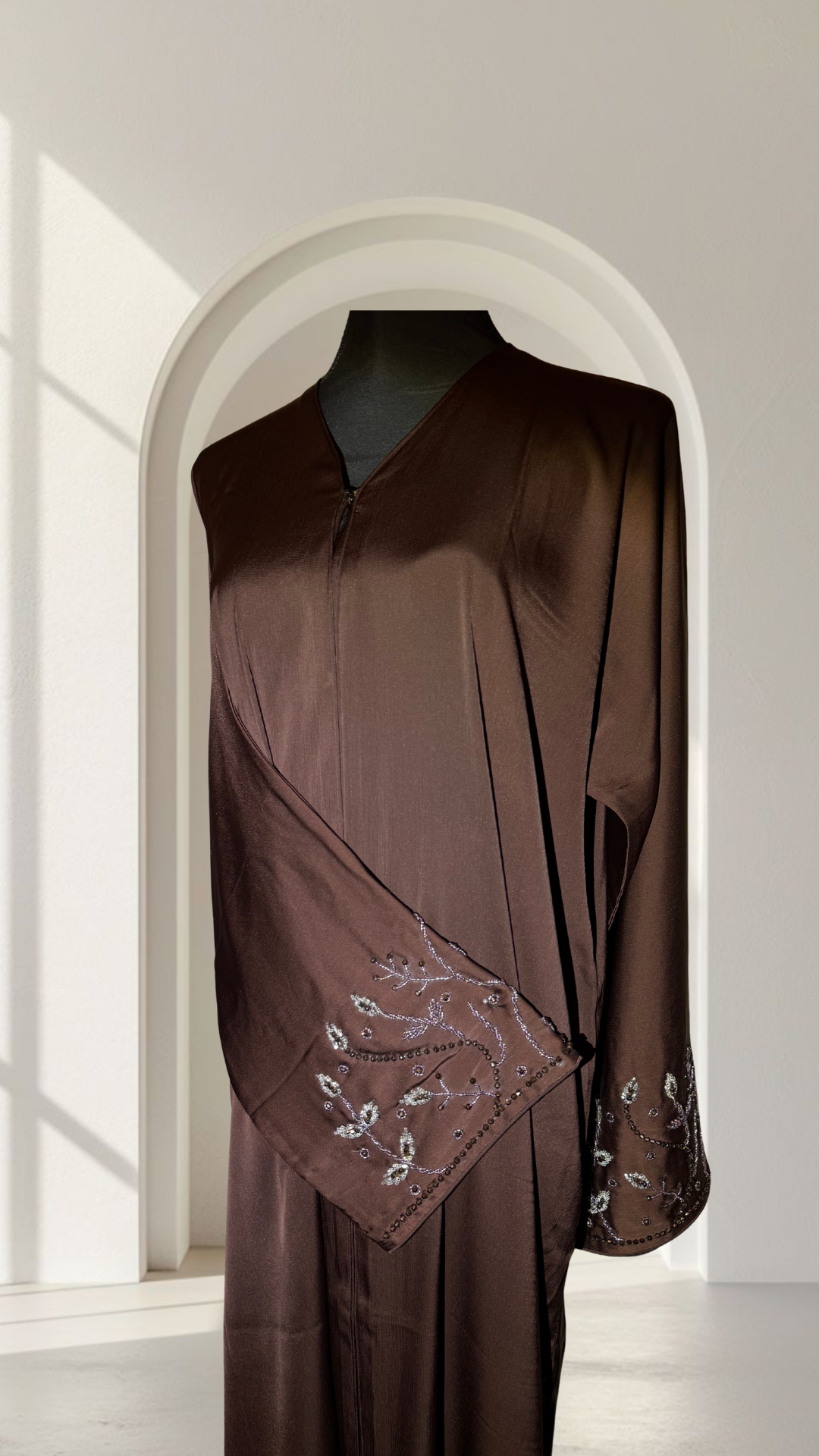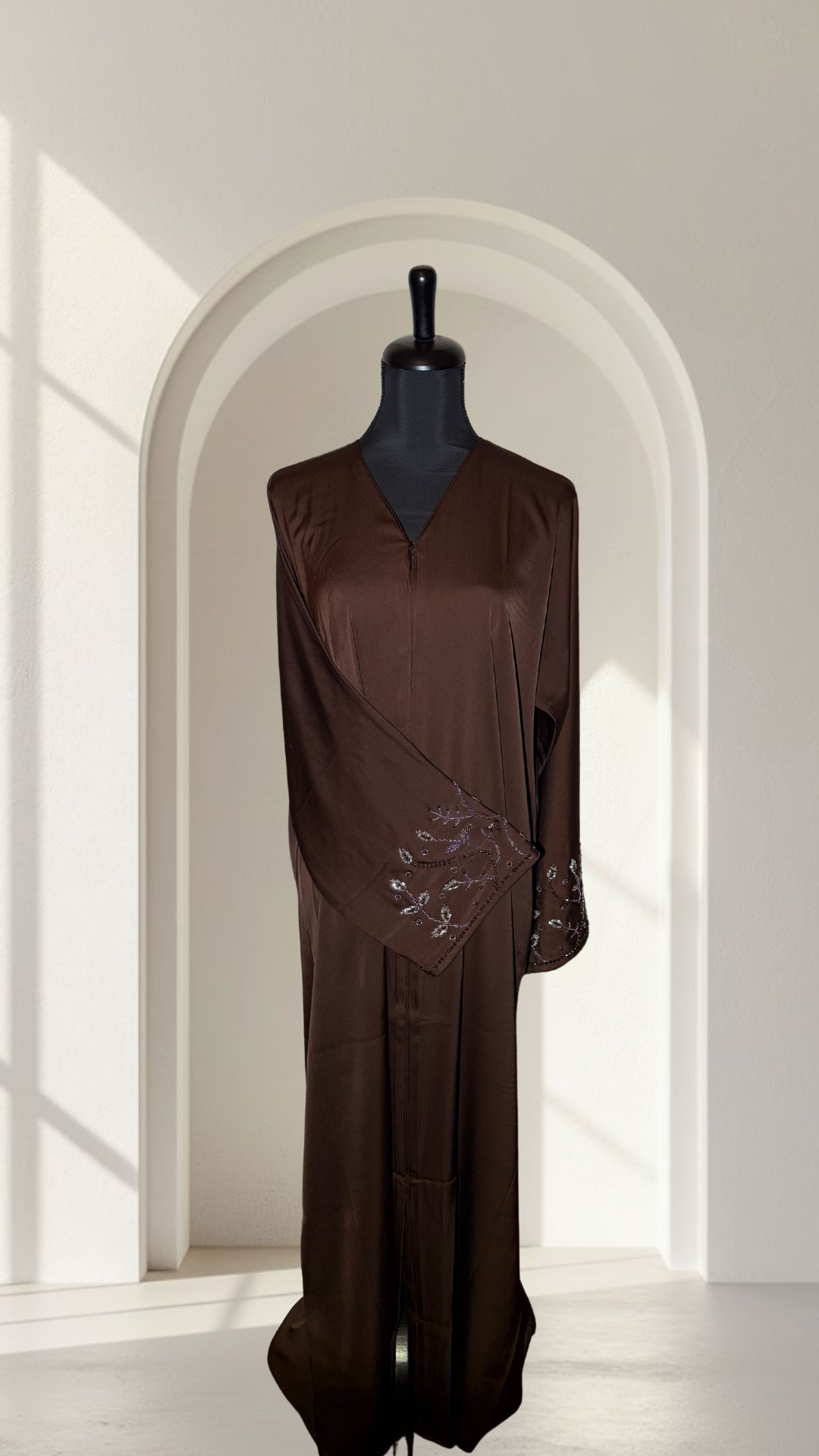 Une abaya marron élégante et fluide, confectionnée en soie coréenne.
