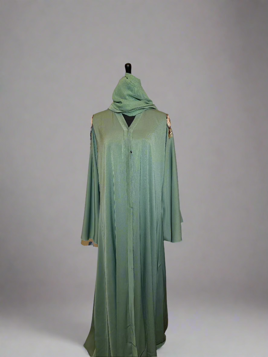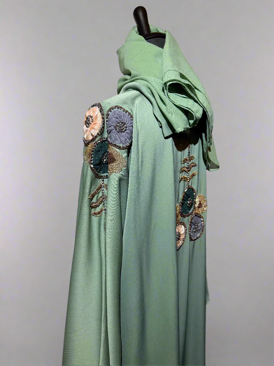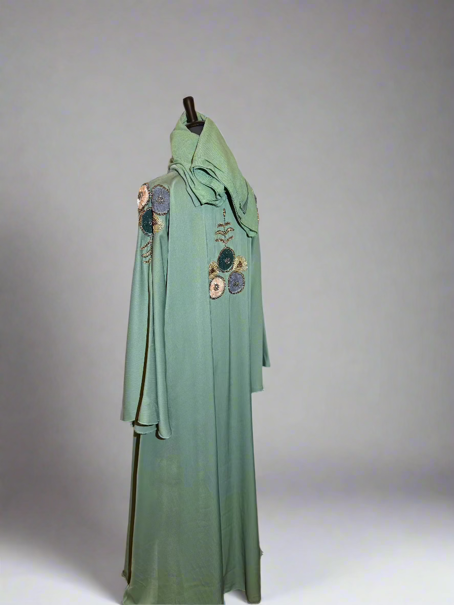 Plongez dans l'élégance avec l'Abaya Zuleina, une création d'exception en vert somptueux. Ses broderies délicates au dos et aux manches attirent tous les regards, tandis que le foulard assorti complète parfaitement votre tenue. Une pièce raffinée qui allie tradition et style contemporain pour sublimer votre silhouette à chaque occasion.